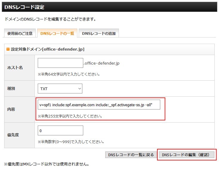 v=spf1 include:spf.ドメインおよびサブドメイン名 include:_spf.activegate-ss.jp -all